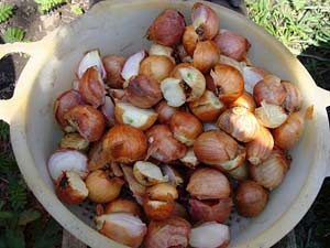 Первый этап – насыщение луковиц влагой. Для этого полчаса замачиваю их в теплой воде, а после очищаю «добела», снимая кроющие чешуи, подрезаю донце (обнажая корешки) и чуть-чуть подщипываю шейку. На 2-3 дня укладываю луковицы в раствор полного минерального удобрения с микроэлементами или марганцем, ежедневно меняя воду. После этого каждую луковицу, независимо от размера, разрезаю пополам, стараясь, чтобы на каждой половинке осталось примерно поровну зачатков корешков. И сразу после этого, сложив луковицы в решето, окунаю их в бордоскую смесь (1-2 столовые ложки медного купороса и 1-2 столовые ложки извести или 1 стакан золы на ведро воды) и обсыпаю золой.