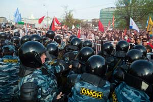 Шеренга омоновцев перед входом на полупустую Болотную площадь, к которой целый час шли многие тысячи демонстрантов, – это гарантированная драка. Либо необходимость на глазах телезрителей всего мира растаскивать тысячи сидящих на асфальте протестующих.