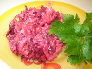 250 г любой рыбы, 3 ст. л. панировочных сухарей, 2 свёклы, 1 соленый огурец, 1 яблоко (лучше зеленое), 100 г сметаны, 3-4 ст. л. растит. масла, соль по вкусу. Рыбу обжарьте в панировочных сухарях до готовности, остудите, измельчите вилкой. Свёклу нарежьте тонкой соломкой. Потушите в растит. масле до готовности, добавьте к рыбе. Добавьте к ним мелко накрошенный огурец и натёртое на тёрке яблоко. Тщательно всё перемешайте и заправьте сметаной.