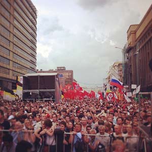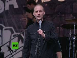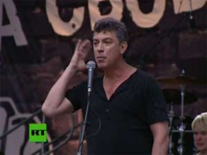 На сцену выходит бывший полицейский. Ушел из органов по мотивам несогласия. Только поздоровался, как толпа заглушила его криками "молодец!"
