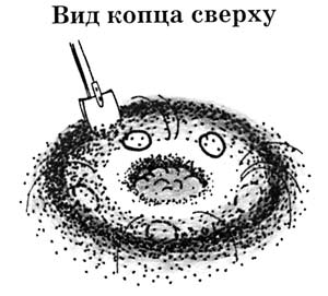 Копец – гребень или небольшой земляной вал шириной 35-40 см, который я нарезаю лопатой в виде кольца диаметром 1,5 м. Внутри кольца – углубление на 5-10 см ниже уровня земли с внешней стороны кургана. В яму диаметром 70-90 см закладываю перегной, доломитовую муку, суперфосфат и золу. А перед посадкой проливаю всё горячим раствором марганцовки темно-розового цвета, чтобы прогреть и продезинфицировать копец. Свежий навоз не кладу даже под осеннюю перекопку – с ним не избежать парши, дуплистости клубней, сорняков.