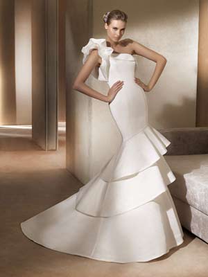 Модное свадебное платье 2012 года прежде всего легкое, воздушное, женственное и романтичное. Никаких массивных форм или плотных, тяжелых тканей, чрезмерных украшений и отделки. Утонченный силуэт, изысканные, легкие и воздушные материалы, изящные украшения, отделка рюшами, складками и драпировками – вот основные признаки очаровательного свадебного платья сезона 2012. Что касается популярных фасонов, то классическое свадебное платье с пышной юбкой а-ля принцесса уступило пальму первенства силуэту русалка или рыбка. Утонченные модели, плотно облегающие красивую фигуру невесты и подчеркивающие все изгибы прекрасного тела, в этом году приобрели более длинный и пышный шлейф. Необходимый объем при сохранении легкости в движении придает использование большого количества рюшей и оборок. Невеста словно плывет в невесомом облаке воздушной полупрозрачной ткани. Многослойная юбка, расширяющаяся от колена к низу, исполнена из нежного тюльмарина, газа, шифона, тюля. Часто можно встретить и комбинацию этих тканей и фактур при сохранении общей легкости силуэта.