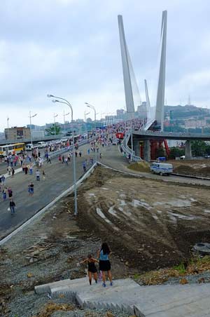 Строительство моста через Золотой Рог началось в 2008 году в рамках подготовки Владивостока к саммиту АТЭС, который пройдет в Приморье в сентябре 2012 года. Двухпилонный вантовый мост через бухту Золотой Рог соединил центр Владивостока с удаленным, но густонаселенным районом мыса Чуркин. Протяженность мостового перехода составила 2,1 км, мост предназначен только для автомобильного транспорта, имеет шесть полос движения и веерную схему вант. Высота пилонов – 226 метров, длина главного пролета – 737 метров, заявленная стоимость строительства – почти 20 млрд рублей. На 11 августа намечено его торжественное открытие.