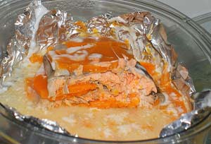 На 500 г любой морской рыбы – 300-400 г тыквы, соль и перец по вкусу, зелень любая – для украшений. Филе рыбы вымойте, обсушите, нарежьте на порции, посолите, поперчите по вкусу. Тыкву очистите и натрите на мелкой терке. На лист фольги выложите половину мякоти тыквы. Равномерно распределите её по поверхности листа, посолите по вкусу, сверху выложите куски филе. Затем ровным слоем выложите оставшуюся мякоть тыквы и посолите. Фольгу плотно заверните и запекайте рыбу в духовке полчаса при 200оС, а выложив на блюдо, украсьте зеленью.