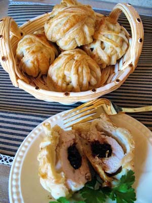 На 2 куриных филе – 400 г грибов (например. Шампиньонов), неполный стакан вареного риса, яйцо, 2 луковицы, соль по вкусу, растит. масло для жарки и 400 г готового слоеного теста. Мелко порежьте лук и обжарьте половину его с мелко порезанным филе, посолите. Грибы мелко порежьте и обжарьте с оставшимся луком. Перемешайте рис, филе с луком и грибами, скатайте из этой смеси шарики. Тесто нарежьте полосками, в эти полоски заверните шарики и выложите на противень. взбейте яйца и смажьте эти клубочки. Запекайте минут 15 в духовке при 180оС.