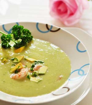 400 г огурцов, пучок зелени, 200 г отваренных креветок, 0,5 л кефира, помидор, лимон, соль, перец – по вкусу. Помидор ошпарить и снять с него кожицу, удалить семена. Один огурец нарезать кубиками, остальные измельчить в блендере с помидором и петрушкой. Полученную массу залить кефиром и лимонным соком, посолить, поперчить. В тарелки разлить суп, добавить креветки. кубики огурцов и рубленую зелень.