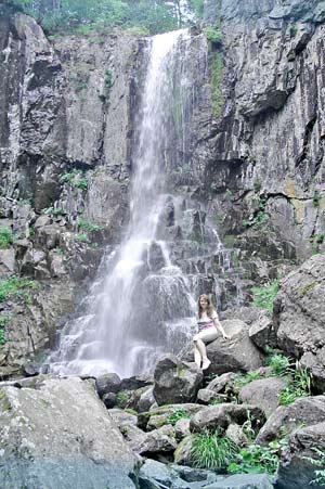 Впервые я оказалась у водопада шесть лет назад. Никогда не забуду, как завороженно внимала шуму воды, удивительной песне водопада. Его географическое название Большой Еломовский. Высота 24 метра. Вода, падающая с высоты, у основания разбивается о практически правильную природную пирамиду из продолговатых четырехгранных уступов. Они почти идеально симметричны от центра, и внизу образуется пенно-волшебная россыпь воды.