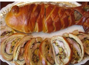 0,5 кг любой морской рыбы, 2 ст. л. муки. 4 ст. л. слив. масла, 4 ст. л. натертого сыра, 0,5 ст. воды, подкисленной соком 1 лимона, 3 ст. л. сливок, соль, перец, зелень, 2 желтка, 300 г грибов (шампиньоны и др.). Филе посолите, порежьте на кусочки и обжарьте в слив. масле с обеих сторон. выложите в глубокую форму или кастрюлю. В оставшийся от жарки жир добавьте муку, воду с лимонным соком, сливки и приготовьте подливку, приправьте её солью, перцем, натёртым на тёрке сыром, измельченной зеленью, добавьте желтки и хорошенько всё перемешайте. На рыбу выложите тушёные в масле грибы и залейте приготовленным соусом.