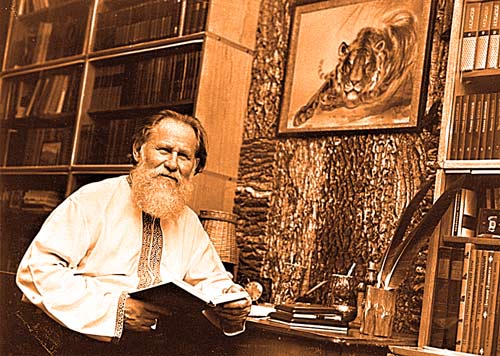 Библиотека из многих тысяч томов, в основном русских писателей. Часть стены его кабинета над рабочим столом обита корою бархатного дерева.