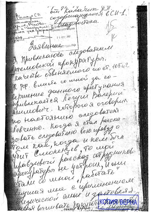 Но за час до очной ставки Павла Калачика избили в камере ИВС города Артема, после чего он скончался. «Покаяние» Калачика не состоялось. Ему так и не удалось опровергнуть собственную явку с повинной. Кроме нее, в деле нет прямых доказательств вины Легуша.