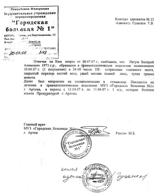 Сведения из гордской больницы № 1 г. Артема о побоях В.А. Легуша |