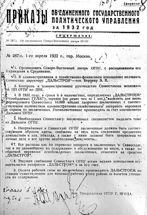 Вопрос рабочей силы на фактически безлюдной Колыме решили быстро и радикально. Новый лагерь ОГПУ «Севвостлаг» был создан в недрах «Дальстроя» практически сразу. 1 апреля 1932 года председатель ОГПУ Ягода уже подписал указ о посылке туда первых 16 тысяч заключенных. С них и началась история колымского ГУЛАГа. Золота в первый год намыли около 0,5 тонн.
