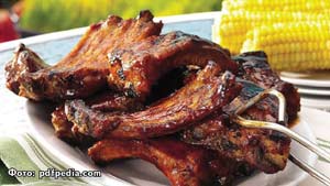 700 г свиной грудинки с рёбрышками, 1 ст. л. молотой паприки, 2 ст. л. острого томатного соуса, 1/4 ст. растит. масла, 2 ст. л. мёда, 2 ст. л. винного уксуса. Свиную грудинку нарежьте кусками по 2 ребра и выложите их в кипящую подсоленную воду, доведите до кипения и варите 30 минут, остудите в кастрюле с водой. В тарелке перемешайте растит. масло, паприку, соус и мёд, посолите и поперчите. Выложите приготовленные рёбрышки на решётку, поставьте её на поддон, наполните водой на 1 см. Смажьте ребрышки приготовленной заправкой и запекайте в духовке 15-20 минут при 220 градусах и 1 раз переверните при запекании. Подавайте с салатом из свежих овощей.