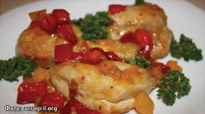 2 куриных окорочка, 1 ст. л. сметаны, треть стакана чернослива, 15 оливок, треть стакана сухого белого вина, 1/4 ст. муки, 2 ст. л. красного винного уксуса, ст.л. сахара, 1 ст. л. томата-пасты, 2 ч. л. орегано, рубленая петрушка. Окорока разрежьте на равные части (или возьмите 6 голеней), 1 ст. л. орегано перемешайте с мукой, обваляйте в этой смеси кусочки курочки. На растит. масле обжарьте кусочки курочки до золотистой корочки, положите их в форму для запекания. Оливки (желательно фаршированные перцем, но если нет, то можно обыкновенные без косточек), чернослив, вино, уксус, сахар, томат-пасту и 1 ст. л. орегано перемешайте и выложите равномерно на курицу. Закройте форму фольгой и поставьте в духовку, разогретую до 180 градусов, запекайте курицу примерно полчаса. Подавайте со сметаной.