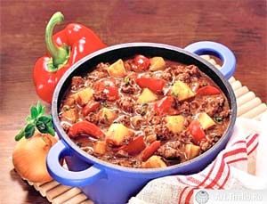 Соевое мясо – 80-100 г, 0,8 л воды или бульона овощного или грибного, раст. масло, лук, 100 г шампиньонов, соль, тмин. 800 мл воды доведите до кипения, посолите, положите соевое мясо. Варите 15-20 минут, не накрывая крышкой, откиньте на дуршлаг. Лук почистите и нашинкуйте мелкими кубиками, обжарьте на раст. масле, добавьте подготовленное соевое мясо и грибы, мелко порубленные, добавьте тмин, посолите, тушите 10 минут. По желанию можно добавить кетчуп и сладкий перец или домашнюю аджику. На основе постного бульона, оставшегося от подготовки соевого мяса, можно приготовить томатный соус с базиликом.