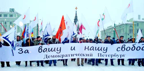 9 декабря в Санкт-Петербурге проходили сразу два разных марша. Первыми маршировали участники коалиции Демократический Петербург. Активисты разных Демократических партий и движений прошли маршем от станции метро «Горьковская» на Марсово поле.