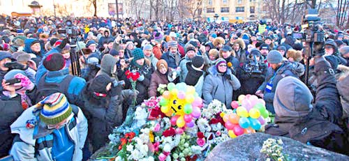«Я еще утром был уверен, что в такой мороз на несогласованную акцию никто из москвичей не придет, – вспоминает Рустем Адагамов. – Однако, когда мы с Навальным и группой фотокоров вышли на Лубянку, оказалось, что весь сквер у Соловецкого камня и тротуары улиц рядом были забиты народом. Люди шли к памятнику в сквере с цветами в руках одним сплошным потоком. Многие клали цветы у камня и уходили сразу, кто-то оставался, и около половины четвертого в сквере было не протолкнуться».