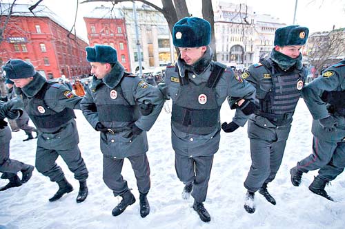 Потом было некоторое затишье… Уж когда народ стал расходиться (Москва по сравнению с Владивостоком – северный город, там темнеет рано), полиция спохватилась. У них же, наверняка, есть план, надо выполнить! Вот они и выполнили в лучших традициях советского аврала в конце месяца. Небольшими колоннами полицаи ввинчивались в толпу, рассекали ее – и хватали первых попавшихся.
