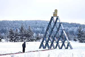 Берем ОМОНовские щиты, и в чистом заснеженном поле строим из них типичный карточный домик. На верхний щит ставим стул. Ну и ковровую дорожку ко всему сооружению.