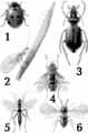 (Окончание. Начало в № 30 "АВ".) Полезные насекомые: 1 - тлевая семиточечная коровка, 2 - златоглазка, 3 - жук красотел, 4 - паразитическая муха тахина, 5 - паразит наездник, 6 - наездник-яйцеед, трихограмма (самка).