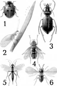 1 - тлевая семиточечная коровка, 2 - златоглазка, 3 - жук красотел, 4 - паразитическая муха тахина, 5 - паразит наездник, 6 - наездник-яйцеед, трихограмма (самка).