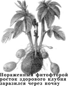 Фитофтороз - грибное заболевание. У картофеля гриб поражает листья, стебли, столоны, клубни, бутоны и ягоды. Во время вегетации первые признаки болезни проявляются на нижних листьях куста в виде темно-бурых мокнущих пятен. Во влажную погоду, особенно утром, на нижней стороне листьев образуется белый налет грибницы. Инфекция с листьев проникает в почву и заражает молодые клубни. На пораженных клубнях появляются бурые твердые пятна, а мякоть окрашивается в розовый цвет. Основной источник инфекции - больные клубни и зараженная почва, если росток даже здорового клубня соприкасается с инфицированным слоем почвы, он заражается болезнью. Таким образом, зараженная почва и больные ростки при благоприятных условиях дают быстрое развитие болезни.