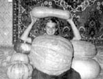 На фотографии в середине изображена тыква Большая Луна весом 43,5 кг. Над головой я держу мускатную тыкву сорта Жемчужная.