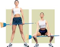 2. Согни ноги в коленях до полуприседа, опустив одновременно руки с метлой. Задержись в этом положении на некоторое время, пока не почувствуешь приятное растяжение мышц. Затем возвратись в исходное положение. Сделай три подхода по 20 раз.