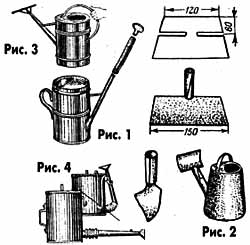 Если обрезать и согнуть, как показано на рис. 2, кусок жести или кровельного железа, то получится отличная насадка к лейке. С ее помощью удобно поливать гряды водой с добавкой коровяка. Лейка не засоряется, а струя из насадки получается веерообразная.