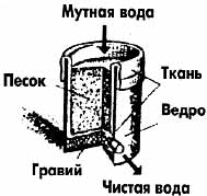 Сделайте для очистки воды фильтр из ведра (см. рисунок). Проделайте ближе к дну ведра отверстие и установите кран. На дно ведра уложите слой мелкого гравия толщиной около 10 см, а выше – кусок хлопчатобумажной ткани, так, чтобы ее края вышли за край ведра. Поверх ткани насыпьте промытый речной песок, ткань заверните наружу и обвяжите бечевкой или наденьте резиновое кольцо.
