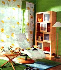 * Возьмите кусок яркой декоративной ткани, оклейте ею, как обоями, часть комнаты (обычно угол, где скапливаются ненужные вещи), а угол – задрапируйте такой же шторой, закрепите на ярком несколько полок – ненавистный угол станет нарядным и привлекательным, новым достижением дизайнерской мысли!