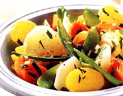 Нарежьте ломтиками 400-500г отваренного картофеля. Отварите с травами, например, с чабером, зеленую фасоль, свежую или замороженную, и добавьте к ней немного консервированной белой фасоли. Приготовьте соус: 2 ст.л. кедровых орешков обжарьте, добавьте пару зубчиков толченого чеснока, 50г тертого сыра, зелень – по полпучка петрушки, базилика, и смешайте все в миксере (немножко орешков оставьте для посыпки). Добавьте уксус и масло, посолите, поперчите, приправьте сахаром. Теперь смешайте вместе картофель, фасоль и соус, посыпьте оставшимися орешками и – приятного аппетита!