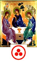 Универсальный вселенский знак триединства на Знамени Мира известен практически всем древним культурам в том или ином виде и трактовке, но, как сообщает сам Николай Рерих, именно «Святая Живоначальная Троица» Андрея Рублева вдохновила его и легла в основу знака Знамени Мира. Каждый, кому близка эта жемчужина русской иконописи, хотя бы раз ощущал ее все растворяющую тишину. А кто-то ощутил и связь ее кипящей аметистом Чаши с собственной Чашей. Как перекрестные радуги, имена Рублева и Рериха призваны осенять Знамя Мира. Вот его и запатентовало МЦР, взяв в личное пользование под предлогом спасения от «грязных рук».