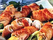 Наконец приступаем к мясу: посолить, поперчить, положить на них грибную начинку, скатать рулетиками и обжарить в оставшемся масле. Влить бульон и потушить минут 10. Подавать рулеты вместе с соусом и запеканкой, украсив травами.