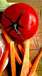 1) На 2 кг моркови – по 1 кг лука, помидоров, 0,5 кг пастернака, 4 корня сельдерея, 4 стручка сладкого перца, небольшой кочан капусты белокочанной и небольшой – цветной, 1 головка чеснока, 1 ст.л. соли.