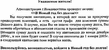 И при этих кощунственных долгах Дальэнерго - на обороте квитанции постоянный призыв: “В Новый год без долгов!” Для меня это оскорбление!
