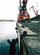В порт в огромном количестве свозится уголь. На территории порта работают десять башенных кранов, которые непрерывно движутся по рельсам. А рельсы идут вплотную к бровке причальной стенки, где расположен пункт наблюдения. Работы там океанологам каждый день немало, при этом уголь ездит над головой наблюдателя, склонившегося к прибору (см. фото 2). Приходится надевать каску. Но это еще не главная фишка. Главная фишка известна всем жителям Посьета и сотням рыбаков подледного лова.