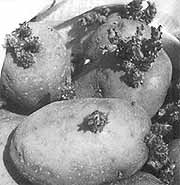 В течение 10-14 дней до посадки клубни выдерживают в помещении или на верандах (закрытых от прямых солнечных лучей). У лежащего в тепле картофеля быстрее развиваются почки (в результате перемещения к глазкам пластических веществ), а рассеянный свет приводит к их позеленению и накоплению глюкозидсоланина (антисептика, защищающего семенные клубни от гниения). Если после посадки наступает похолодание и льют дожди, сильно уплотняющие почву, то непрогретые и неозелененные клубни прорастают особенно медленно, всходы появляются с большим запозданием – через 30-35 дней, и те подчас загнивают.