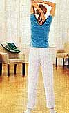 Голову держите прямо, подбородок слегка приподнят, взгляд устремлен вперед. Надавливая правой рукой, постарайтесь продвинуть левую руку как можно дальше за спину. При появлении боли прекратите занятия.