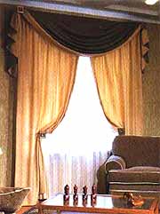 В просторной гостиной можно на окнах использовать американский опыт. Под потолком устанавливается карниз – даже самая простая трубка (даже кусок старой водопроводной трубы можно использовать). На неё накидывается-наматывается длинный отрез яркой ткани, которую можно наматывать, сдвигать в одну сторону или по всей ширине, завязывать свободными узлами, собирать складками, оставлять шлейф до пола или поднять повыше. Полная свобода смены настроения и формы штор обеспечены!