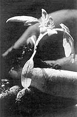 Горизонтальная посадка. Если переросшая рассада получается помимо моего желания и я с нее не срезал облиственные черенки, то такую рассаду на постоянное место высаживаю в лежачем положении так, чтобы корень был обращен на юг, а верхушка стебля – на север. Корень и 2/3 стебля (без листьев) присыпаю питательной почвой слоем 8-12 см. Оставшаяся треть стебля с листочками через несколько дней поднимется с поверхности почвы в сторону солнца и принимает вертикальное положение. Зарытая часть стебля со временем превращается в мощный корень. Растения с такими корнями дают хороший урожай.