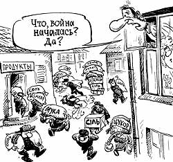 Правда, до любимого многими совка люди не опустились, никто не вопил: «Больше двух пачек в одни руки не давать!» Поэтому брали помногу. После соли очередь пришла к спичкам, свечкам, крупе, макаронам - и далее по списку. Многие не поддавались панике, но стоящих в очереди не осуждали. А когда вдруг сами решали купить пачку соли или кило сахару, вдруг обнаруживали, что товар смели до них. Тогда опоздавшие, кляня свою недальновидность, создавали очередь к другим списочным продуктам.