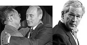 КНДР пугала ракетами Америку, запустив их в день Независимости США, но ракеты оказались вблизи российских берегов. Возникает вопрос, почему в таком случае наши власти высказываются за лояльные санкции в отношении Северной Кореи, а США, Япония и Англия – за жесткие. Получается, что Ким Чен Ир пугает Буша из-за плеча Путина ?