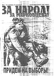 Дело в том, что кандидат Марковцев в своей предвыборной агитации широко использовал общеизвестные советские плакаты («Дойдем до Берлина», «А ты записался добровольцем?» и др.) в газете-листовке «За народ!»