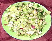 4 ст. квашеной капусты, 2-3 кислых яблока. 4 ст.л. слив. масла, луковица, 600 г жареного филе лосося (или др. рыбы), 2 соленых огурца, маринов. грибы, маслины, зелень… Смажьте слив. маслом глубокий сотейник, выложите на дно слой квашеной капусты, затем слой из мелких кусочков яблок, обжарьте филе в раст. масле до золотистого цвета, затем здесь же пассеруйте лук. Выложите рыбу и лук в сотейник. Посыпьте свежей зеленью, перцем, измельченным лавровым листом и запекайте до образования румяной корочки. Перед подачей украсьте маринованными грибами, маслинами, солеными огурцами. Посыпьте толчеными сухарями.