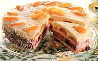 5 яиц, 0,5 ст.сахара,1 ч.л. корицы,1 ст. молотых орехов (лесных или грецких), 5 ст.л. муки, 2 ч.л. разрыхлителя, 1 банка консервированных мандаринов, 2 ст.л. сахара для сиропа, слив. масло. Тщательно разотрите яйца с сахаром и корицей до однородной массы, добавьте часть орехов и смешанную с разрыхлителем муку, смажьте небольшим количеством масла тефлоновую сковороду, выложите тесто, плотно закройте крышкой и выпекайте на плите или в хорошо разогретой духовке около часа, затем выложите торт и остудите. Красиво оформите бисквит мандариновыми дольками. Приготовьте сироп из сока консервированных мандаринов с сахаром, для этого прокипятите его минут 5, остудите и полейте сиропом, чтобы он хорошо пропитался, украсьте орехами.