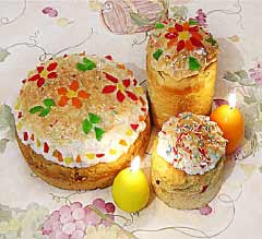 А пасхальный стол издавна славится обильностью яств и красотой. Дом уже должен быть вымыт и сиять чистотой и красотой, и к богатому столу постарайтесь приготовиться заранее: и яички накрасить, и зеленой травки вырастить, поскольку разноцветные яички наряднее всего смотрятся среди травки, и куличи-пасхи и холодцы готовы заранее. А легкие закуски да салаты и жаркое можно быстренько соорудить в последний момент. Конечно, весенний куличик - кексик можно сейчас запросто купить готовеньким. Только уж больно вкусен свой кулич да пасха! Так что если уж захочется самим сделать – Домовой всегда рад поделиться рецептами. Вот два из них.