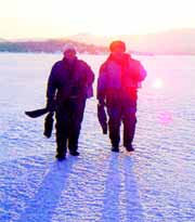 На моих глазах в последнее воскресенье провалились у самой прибойки бухты Воевода двое рослых мужиков – по горло глубина. Завершали сезон, «заловились» - довольные: полные рундуки, расхохотались до неба! Надо же так. Выкарабкивались богатыри – будто на финишную ленточку налегали грудью в многомесячном ледовом марафоне. Возможно, подвела тяжесть рундуков. Тут же достали запасные свитера, включили газовые плитки, отсушились бывалые, развесив комбинезоны на страховочных веревках из рюкзаков.