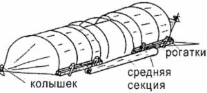 В жаркую погоду на день рогатки вынимаю, пленку сматываю на рейку и укладываю на тропу между грядками. Чтобы пленка оставалась чистой, тропу предварительно посыпаю опилками. На рисунке показана теплица со снятой средней секцией.