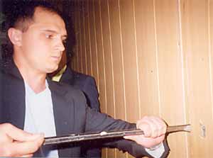 Женщины (а в ателье работают, конечно же, только женщины) выметаться не стали и заперлись в помещении. Тогда нетерпеливый новый собственник Александр Леоненков попытался вскрыть дверь ломом (см. фото). Разумеется, эти действия сопровождались соответствующими выражениями.